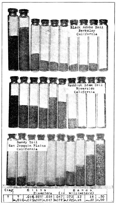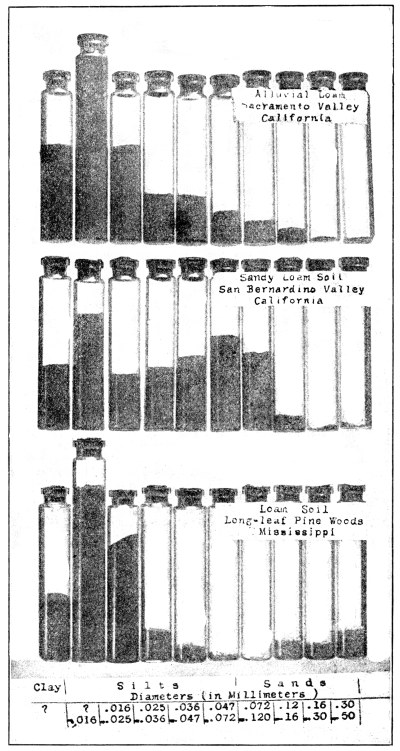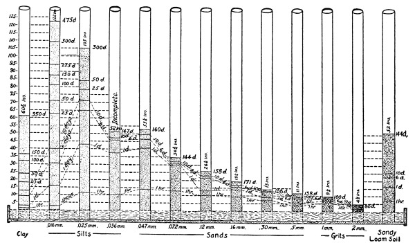 Physical Composition of Soils, 83.—Clay as a Soil Ingredient, 83.—Amounts of Colloidal Clay in Soils, 84.—Influence of Fine Powders on Plasticity, 85.—Rock Powder; Sand, Silt and Dust, 86.—Weathering in Humid and Arid Regions, 86.—Sands of the Humid Regions, 86.—Sands of Arid Regions not Sterile, 86.—Physical Analysis of Soils, 88.—Use of Sieves. Limits, 88.—Use of Water for Separating Finest Grain-Sizes, 89.—Elimination of Clay by Subsidence and Centrifugal Method, Hydraulic Elutriation, 90.—Schöne’s Instrument, 90.—Churn Elutriator with Cylindrical Tube, 91.—Figures of Same, 91.—Yoder’s Centrifugal Elutriator, 92.—Number of Grain-sizes Desirable, 93.—Results of such Analyses, 93.—Physical Composition Corresponding to Popular Designations of Soil-Quality. Table, 96.—Number of soil-grains per Gram, 99.—Surface Offered by various Grain-sizes, 99.—Influence of the several Grain-sizes on Soil Texture, 100.—Ferric Hydrate, its Effects on Clay, 100.—Other Substances, 101.—Aluminic Hydrate, 101.—Influence of Granular Sediments upon the Tilling Qualities of Soils, 102.—“Physical” Hardpan, 103.—Putty Soils, 103.—Dust Soils of Washington; Table, Physical Analyses of Fine Earth, 104.—Slow Penetration of Water, 105.—Effects of Coarse Sand, 105.