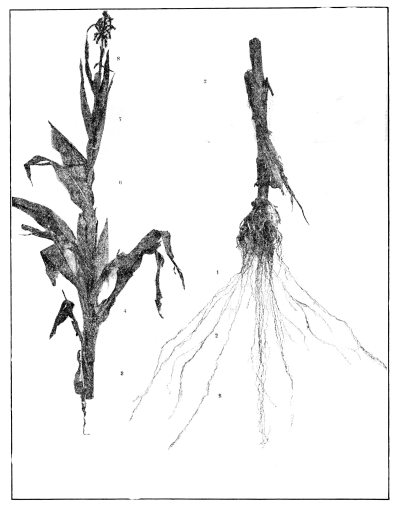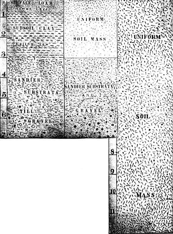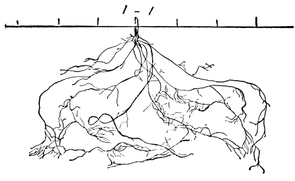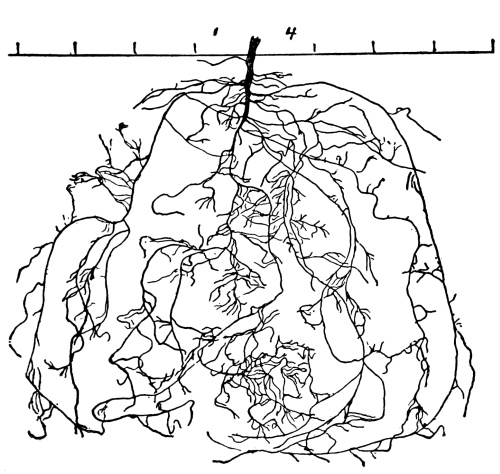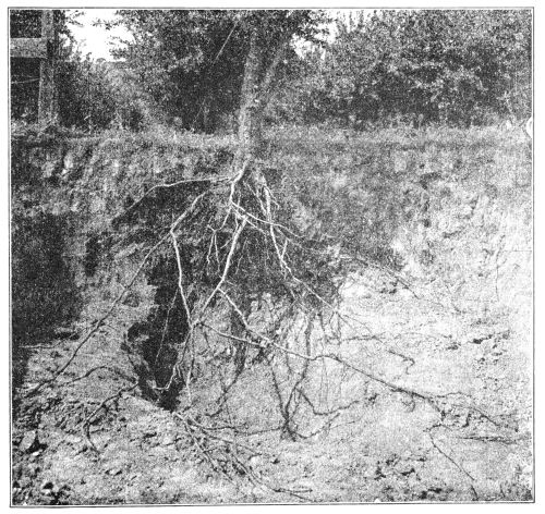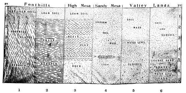 Soil and Subsoil in their Relations to Vegetation, 161.—Physical Effects of the [Pg ix] Percolation of Surface Waters, 161.—Chemical Effects; Calcareous Subsoils and Hardpans, 161.—“Rawness” of Subsoils in Humid Climates, 162.—Subsoils in the Arid Region, 163.—Deep Plowing and Subsoiling in the Arid Region; examples of Plant growth on Subsoils, 164.—Resistance to Drought, 167.—Root System in the Humid Region, 168.—Figures of the Root System of an Eastern (Wisconsin) Fruit Tree, 168.—Comparison of Root Development in the Arid and Humid Regions, 169.—Prune on Peach Root, 169.—Adaptation of Humid Species to Arid Conditions, 169.—Grapes, 170.—Kentucky and California Maize, 175, 176.—Hops, 172.—Deep-Rooting in the Arid Region, 174.—Goose Foot and Figwort, 174.—Importance of Proper Substrata in the Arid Region, 173.—Injury from Impervious Substrata. Figure, 177.—Faulty Lands of California. Figure, 178.—Shattering of Dense Substrata by Dynamite, 181.—Leachy Substrata, 182.—“Going-back” of Orchards, 182.—Hardpan, Formation and Varieties, 183.—Nature of the Hardpan Cements, 184.—Bog Ore, Moorbedpan and Ortstein; Calcareous and Alkali Hardpan, 184.—The Causes of Hardpan, 185.—“Plowsole,” 186.—Marly Substrata, 186.