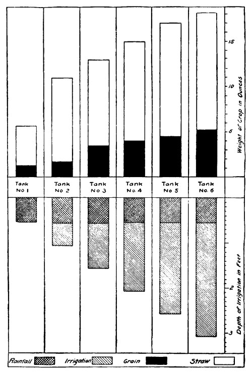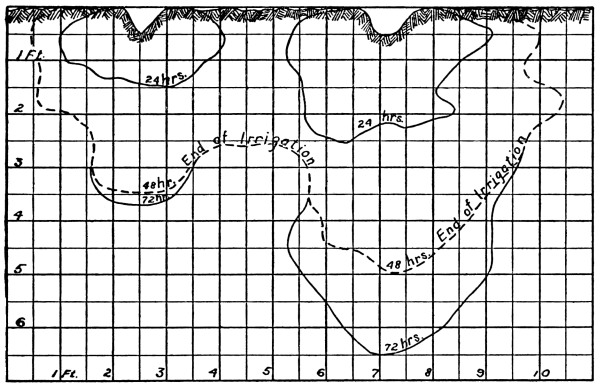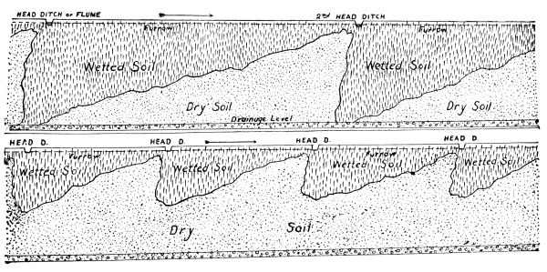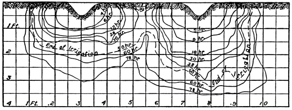 Water of Soils; The Regulation and Conservation of Soil, Moisture; Irrigation, 234.—Loosening of the Surface, 234.—Effects of Underdrains; Rain on Clay Soils, 235.—Winter Irrigation, 236.—Methods of Irrigation, 236.—Surface Sprinkling, 237.—Flooding, 237.—Check Flooding. Furrow Irrigation, 237, 238.—Figure Showing Penetration, 239.—Figure Showing Faulty Irrigation in Sandy Lands, 239.—Distance between Furrows and Ditches, 241.—Irrigation by Lateral Seepage, 242.—Basin Irrigation of Trees and Vines; Advantages and Objections, 243.—Irrigation from Underground Pipes, 245.—Quality of Irrigation Waters, 246.—Saline Waters; Figures of Effects on Orange Trees, 246.—Limits of Salinity, 246.—Mode of Using Saline Irrigation Waters; Apparent Paradox, 249.—Use of Drainage Waters for Irrigation, 250.—“Black Alkali” Waters, 250.—Variations in the Salinity of Deep and Shallow Wells, 250.—Muddy Waters, 251.—The Duty of Irrigation Waters, 251.—Causes of Losses, 252.—Loss by Percolation. Figure, 252.—Evaporation, 253.—Tables Showing same at California Stations, 255.—Evaporation in Different Climates; Table, 255.—Evaporation from Reservoirs and Ditches, 257.—Prevention of Evaporation; Protective Surface Layer, 257.—Illustrations of Effects of Tillage; Table, 258.—Evaporation through Roots and Leaves, 262.—Weeds waste Moisture, 264.—Distribution of Moisture in Soils as Affected by Vegetation, 264.—Forests and Steppes, 265.—Eucalyptus for Drying Wet Lands, 265.—Mulching; Effects on Temperature and Moisture, 266.