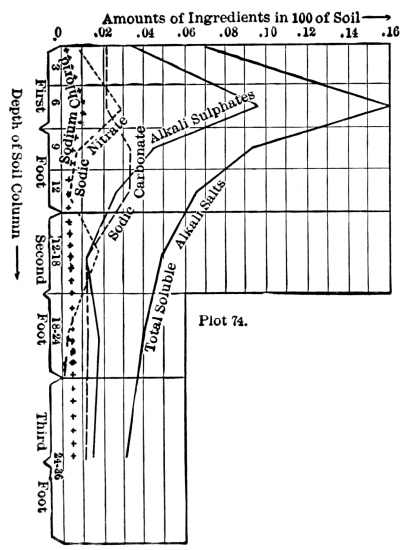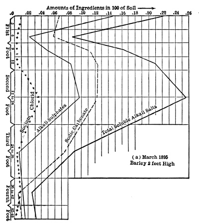 [168] In this designation are included, in this volume, both the normal (mono-) carbonate and the two other compounds, the bi- or hydrocarbonate and the intermediate (so-called sesqui-) compound or trona; all of which are commonly present simultaneously, but in utterly indefinite relative proportions, varying from day to day and from inch to inch of depth, inasmuch as their continued existence depends upon the greater or less formation of carbonic acid in the soil, and the access of air. Hence their separate quantitative determination at any one time is of little practical interest. All naturally occurring carbonate of soda contains, and sometimes consists of, these “super-carbonates,” according to the greater or less exposure to air and solar heat. They are much milder in their action on plants than the monocarbonate, which unfortunately, in the nature of the case, always predominates near the surface, and thus injures the root-crown.