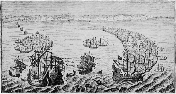 This attack by fire-boats was a new way of276 fighting. The Spaniards were perplexed and horrified. Their only thought was to escape anywhere, no matter where, if only they could get free from these terrors. In their haste anchor chains fouled, some ships collided, others burned or ran aground.