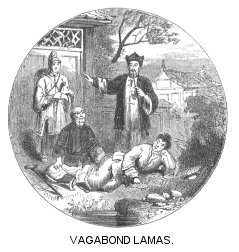 A little before night, an immense bustle pervaded the inn. A Living Buddha had arrived, with a numerous train, on his return from a journey into Thibet, his native country, to the grand Lamasery, of which for many years he had been the superior, and which was situated in the country of the Khalkhas, towards the Russian frontier. As he entered the inn, a multitude of zealous Buddhists, who had been awaiting him in the great courtyard, prostrated themselves before him, their faces to the ground. The Grand Lama proceeded to the apartment which had been prepared for him, and night coming, the crowd withdrew. When the inn had become tolerably clear, this strange personage gave full play to his curiosity; he poked about all over the inn, going into every room, and asking everybody all sorts of questions, without sitting down or staying anywhere. As we expected, he favoured us also with a visit. When he entered our chamber, we were gravely seated on the kang; we studiously abstained from rising at his entrance, and contented ourselves with welcoming him by a motion of our hands. He seemed rather surprised at this unceremonious reception, but not at all disconcerted, Standing in the middle of the room, he stared at each of us intently, one after the other. We, like himself, preserving entire silence all the while, exercised the privilege of which he had set us the example, and examined him closely. Be seemed about fifty years old; he was enveloped in a great robe of yellow taffeta, and he wore red velvet Thibetian boots, with remarkably thick soles. He was of the middle height, and comfortably stout; his dark brown face denoted extreme good nature, but there was in his eyes, when you attentively examined them, a strange, wild, haggard expression, that was very alarming. At length he addressed us in the Mongol tongue, which he spoke with great facility. In the first instance, the conversation was nothing more p. 284than the ordinary phrases exchanged between travellers, about one another’s health, destination, horses, the weather, and so on. When we found him prolonging his visit, we invited him to sit down beside us on the kang; he hesitated for a moment, conceiving, no doubt, that in his quality as Living Buddha, it did not become him to place himself on a level with mere mortals like ourselves. However, as he had a great desire for a chat, he at last made up his mind to sit down, and in fact he could not, without compromising his dignity, remain any longer standing while we sat.
