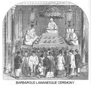 The Pope having, about the year 1844, been pleased to establish an Apostolic Vicariat of Mongolia, it was considered expedient, with a view to further operations, to ascertain the nature and extent of the diocese thus created, and MM. Gabet and Huc, two Lazarists attached to the petty mission of Si-Wang, were accordingly deputed to collect the necessary information. They made their way through difficulties which nothing but religious enthusiasm in combination with French elasticity could have overcome, to Lha-Ssa, the capital of Thibet, and in this seat of Lamanism were becoming comfortably settled, with lively hopes and expectations of converting the Talé-Lama into a branch-Pope, when the Chinese Minister, the noted Ke-Shen, interposed on political grounds, and had them deported to China. M. Gabet was directed by his superiors to proceed to France, and lay a complaint before his Government, of the arbitrary treatment which he and his fellow Missionary had experienced. In the steamer which conveyed him from Hong Kong to Ceylon, he found Mr. Alexander Johnstone, secretary to Her Majesty’s p. iiPlenipotentiary in China; and this gentleman perceived so much, not merely of entertainment, but of important information in the conversations he had with M. Gabet, that he committed to paper the leading features of the Reverend Missionary’s statements, and on his return to his official post, gave his manuscripts to Sir John Davis, who, in his turn, considered their contents so interesting, that he embodied a copy of them in a dispatch to Lord Palmerston. Subsequently the two volumes, here translated, were prepared by M. Huc, and published in Paris. Thus it is, that to Papal aggression in the East, the Western World is indebted for a work exhibiting, for the first time, a complete representation of countries previously almost unknown to Europeans, and indeed considered practically inaccessible; and of a religion which, followed by no fewer than 170,000,000 persons, presents the most singular analogies in its leading features with the Catholicism of Rome.