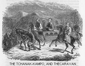 We had been six days at Tang-Keou-Eul, when a small caravan of Tartar-Khalkhas arrived at our House of Repose. It came from the frontiers of Russia, and was on its way to Lha-Ssa to offer up its adorations to a young child, which, the people were informed, was the famous Guison-Tamba newly transmigrated. When the Tartars learned that we were awaiting a favourable opportunity for proceeding towards Thibet, they were delighted, fully appreciating the fact that their troop, in this unexpected accession of three pilgrims, received an accession, also, of three combatants in the event of a fight with the Kolo. Our beards and mustachios inspired them with an exalted idea of our valour, and we were forthwith decorated by them with the title of Batourou (braves). This was all exceedingly honourable and seductive; but still, before we finally decided upon joining the cavalcade, we thought it expedient to consider the various aspects of the matter gravely and maturely.