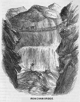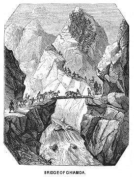Four days after our departure from Kiang-Tsa, we reached the banks of the Kin-Cha-Kiang (River of Gold-dust), which we had already crossed on the ice with the Thibetian ambassador, two months before our arrival at Lha-Ssa. Amid the beautiful plains of China, this magnificent river rolls on its blue waves with an imposing majesty; but among the mountains of Thibet, it is ever bounding about, throwing the great mass of its waters to the bottom of gorges and valleys, with terrible impetuosity and noise. At the spot where we came to the river, it was enclosed between two mountains, the sharp flanks of which, rising perpendicularly on its banks, made for it a narrow but extremely deep bed; the waters ran rapidly, sending forth a low and lugubrious sound. From time to time, we saw huge masses of ice approach, which, after having whirled round in a thousand eddies, at last were dashed to pieces against the sharp projections of the mountain.