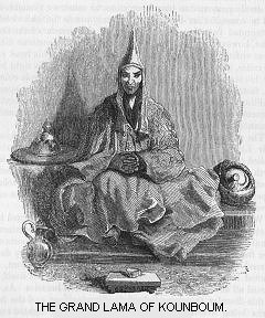 At eleven leagues from Tang-Keou-Eul there is, in the land of the Si-Fan, or Eastern Thibetians, a Lamasery, whose fame extends not merely throughout Tartary, but even to the remotest parts of Thibet. Thither pilgrims flock from all quarters, venerating; for there was born Tsong-Kaba-Remboutchi, the famous reformer of Buddhism. The Lamasery bears the name of Kounboum, and its Lama population numbers no fewer than 4,000 persons, Si-Fan, Tartars, Thibetians, and Dchiahours. It was determined that one of us should visit this place, and endeavour to engage a Lama to come and teach us for a few months the Thibetian language. M. Gabet, accordingly, departed on this mission, accompanied by Samdadchiemba, while M. Huc remained at Tang-Keou-Eul, to take care of the animals and of the baggage.