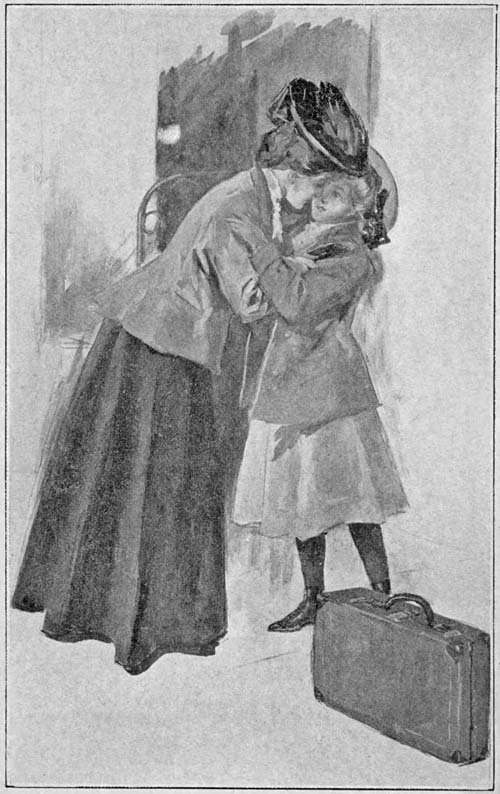 “There’s dried peach turnovers in that basket an’ some my hen chicken’s best hard-boiled eggs in Mr. Hale’s suit case!” almost screamed Mrs. Benton as the whole party moved forward toward the train. “There’s a jar of picked-off roast quail and—Good-by, Jessie Trent! Good-by! Don’t take no sass from nobody and do, I beg of you, do keep—your stockin’s—mended;[13] Oh! my stars an’ garters! Oh! my! my suz!” wailed the poor woman, as the girl she so dearly loved was swept away from her without even one parting hug.