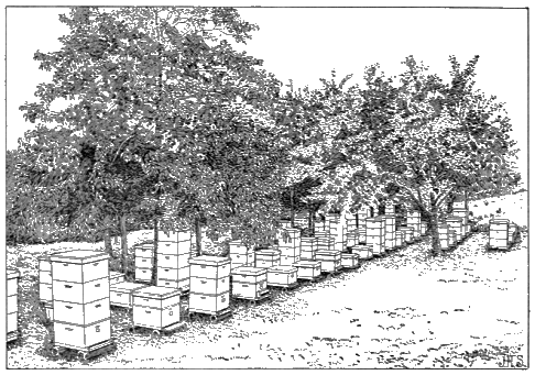 The location of the hives is a matter of considerable importance. As a rule it is better for hives to face away from the prevailing wind and to be protected from high winds. In the North, a south slope is desirable. It is advisable for hives to be so placed that the sun will strike them early in the morning, so that the bees become active early in the day, and thus gain an advantage by getting the first supply of nectar. It is also advantageous to have the hives shaded during the hottest part of the day, so that the bees will not hang out in front of the hive instead of working. They should be so placed that the bees will not prove a nuisance to passers-by or disturb live stock. This latter precaution may save the bee keeper considerable trouble, for bees sometimes prove dangerous, especially to horses. Bees are also sometimes annoying in the early spring, for on their first flights they sometimes spot clothes hung out to dry. This may be remedied by having the apiary some distance from the clothes-drying yard, or by removing the bees from the cellars on days when no clothes are to be hung out.