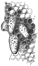 A number of insects, birds, and mammals must be classed as enemies of bees, but of these the two wax moths, and ants, are the only ones of importance. There are two species of moth, the larger wax moth (Galleria mellonella L.), and the lesser wax moth (Achroia grisella Fab.), the larvæ of which destroy combs by burrowing through them.[3] Reports are frequently received in the department that the larvæ of these moths (usually the larger species) are destroying colonies of bees. It may be stated positively that moths do not destroy strong, healthy colonies in good hives, and if it is supposed that they are causing damage the bee keeper should carefully study his colonies to see what other trouble has weakened them enough for the moths to enter. Queenlessness, lack of stores, or some such trouble may be the condition favorable to the entrance of the pest, but a careful examination should be made of the brood to see whether there is any « 44 » evidence of disease. This is the most frequent cause of the cases of moth depredation reported to this department. Black bees are less capable of driving moth larvæ out, but, even with these bees, strong colonies rarely allow them to remain. The observance of the golden rule of beekeeping, "Keep all colonies strong," will solve the moth question unless disease appears.