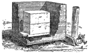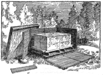 For those having only a few colonies, it is not always convenient to build cases for colonies in groups of four. It is not necessary to give dimensions in detail for those having a few colonies, however, for they will usually wish to use whatever they have at hand. It is often possible to arrange a heavy wooden box, such as those used for shipping dry goods (fig. 4), so as to make a winter case for one colony which will answer every purpose. It is, of course, necessary that the salient feature of a good winter case be preserved. If the arrangement of the apiary makes it inconvenient to have the colonies in groups of four throughout the year, it is quite possible to make good cases for two colonies. Anything other than the four-colony case, however, will probably cost more per colony, or if too many colonies are put into larger cases there may be trouble from other causes, as from drifting.