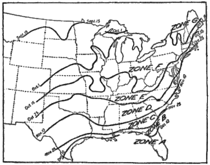 The lines on figure 5 indicate the average dates of the first killing frost in the fall, and these dates, given at the ends of the heavy lines, are of direct value to the beekeeper as giving the proper time for putting on the winter cases. The average dates of the last killing frost in the spring do not show exactly the same lines on the maps, but the differences are not sufficiently great to justify the use of a separate map for this purpose. The authors have chosen therefore to divide the country into the zones indicated, and the recommendations given below apply to each of the zones shown.