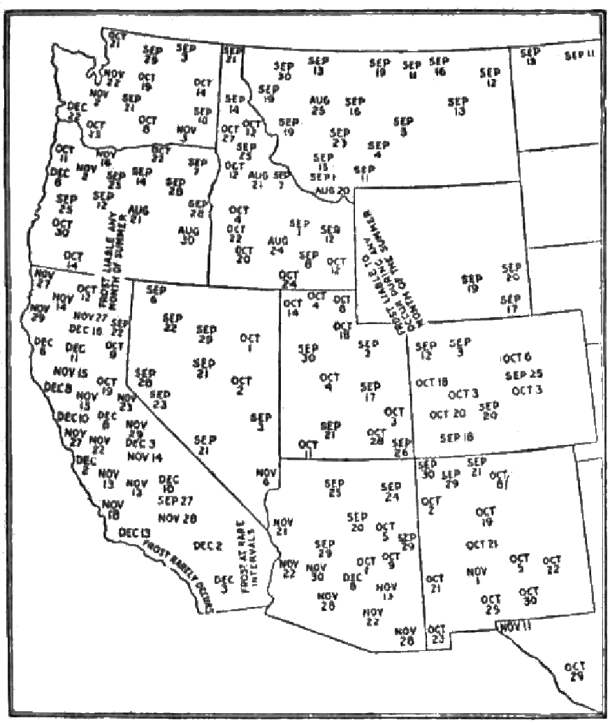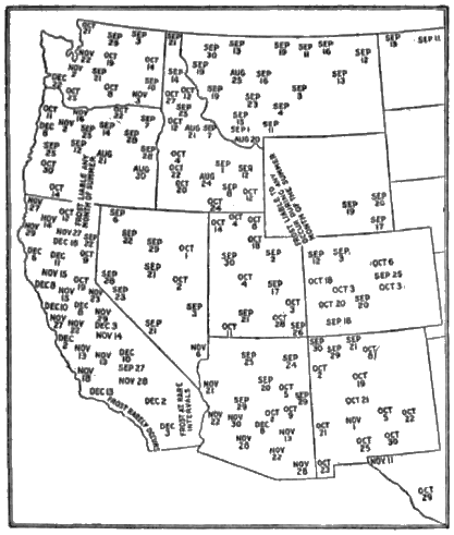 On account of the variations in elevation, it is impossible to carry these lines into the Rocky Mountain region, but as packing is just as necessary in the West as in the East, figure 6 is inserted to indicate roughly the time for the putting on of the packing in the fall. The dates in this map are the average dates of the first killing frost. By consulting Table I the beekeeper of the West may learn the time advised for the removal of the packing, by placing his locality in its proper zone, on the basis of the first killing frost.