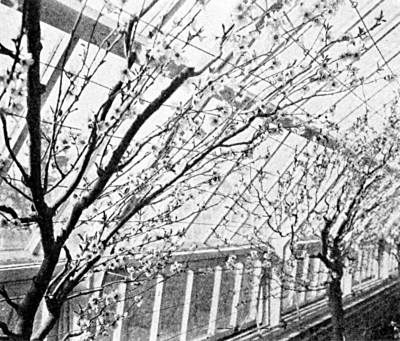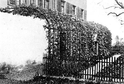 In a very similar manner apple, pear or plum trees may be trained so as to form an arched arbor way. In this kind of make-up they present a most agreeable novelty. An example of this kind of training is[Pg 18] shown in the illustration, page 5. For this purpose cordon trees are usually best; though peach or apricot trees in U-form or double U-form will answer very well. Even apple trees or pears formed as palmettes-Verrier can be carried up over an arched trellis.