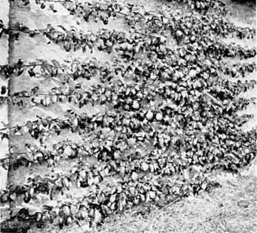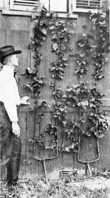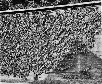 4. For covering walls and fences.—There are many places about every farm, suburban establishment, or even about many city homes, where back walls and fences could be put out of sight very agreeably by almost any sort of foliage. Various ornamental climbers and creepers are in vogue for this service; but a[Pg 16] certain number of such unattractive walls and fences could be treated quite as acceptably, from the esthetic point of view, with trained fruit trees, and the result would be more satisfactory in some other ways. Apples or pears trained as cordons or espaliers, or peaches, nectarines, or cherries in fan forms, will thrive on almost any brick or wooden wall, except those with a northern front. It is necessary only to supply a proper soil, to plant sound trees of proper sorts, and to give them the prescribed care. The result is not only a thing of beauty but one of practical utility as well.