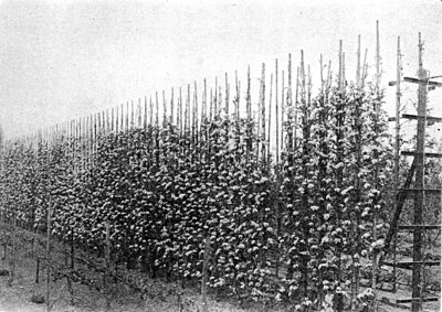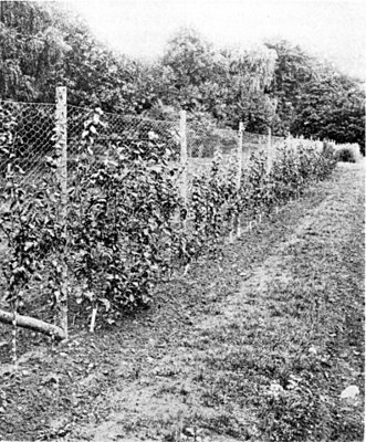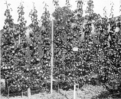 A wire trellis, built much like a grape trellis, only higher, carries the row of upright cordon apples. Some of these bore fruit the first year they were planted, and there has been a fair sprinkling of fruit every year since then. This has been one of the most satisfactory lots in the make-up.