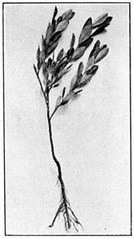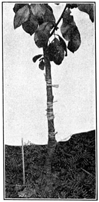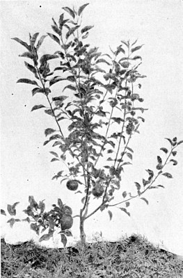 The Paradise apple so-called (Fig. 7) is simply one[Pg 24] of these dwarf varieties which can be reproduced freely and cheaply. This reproduction is secured nearly always by means of mound layerage. As the variety does not come true to seed, any more than such varieties as King or Hubbardston do, some such method of propagation is necessary. This Paradise apple is naturally inclined to stool out somewhat from the roots. This habit is encouraged by cutting the plants back to the ground. When the young shoots are thrown up they are banked up with a hoe or by plowing furrows up against the rows of plants. The young shoots then form roots at the base and these rooted shoots or layers are removed when one year old. They are then planted in nursery rows in the spring, where they are usually budded the following July or August.