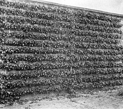 When we come to the two rows of horizontal cordon apples, though, the real fun has begun. Nearly all these trees are in bearing, and a few of them have borne every year since they were planted out. They are set only three feet apart in the row, which is not enough; and they suffered terribly the first year from a midsummer attack of aphides; and the pruning was neglected to allow them to recover from that scourge, so that the form was somewhat injured; but they have never ceased to be a joy to me and a wonderment to visitors. They are mostly of European varieties, but Bismarck is the showiest and most fruitful one in the collection, though far from the best to eat.