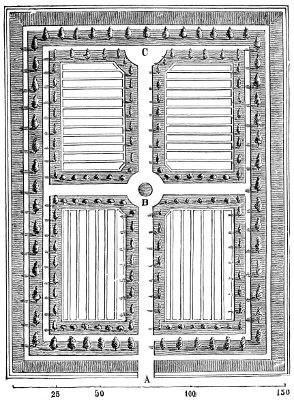 Next there comes a trellis bearing some espaliers, including plums, pears, apples, peaches and cherries; but these have been recently planted, and as yet they have done nothing worth relating.