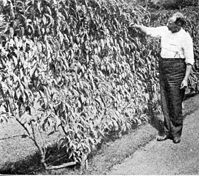 There are many places where the owner of a city or suburban lot can secure the fun and the substantial benefits belonging to the fruit grower on land that would be otherwise wasted, if he will only build a woven wire fence on the property line between him and his not-too-agreeable neighbor, using this fence as a support for a row of cordon plums, pears or apples. If he has time and inclination to do a little more work with the trees he can better plant U-form peaches, nectarines or apricots, or he can grow plums in U-form, or he can have fan-form cherry trees, or apples or pears in Verrier-palmettes. One of the most interesting and productive lots in the author's dwarf fruit garden is a row of plum trees on such a woven wire trellis. The trees in this row stand two feet apart, and form a perfect screen. (Fig. 6.) The majority of the trees which were necessarily taken for planting this row were not propagated on suitable stocks, and many varieties were introduced for experimental purposes which were obviously unadapted to this mode[Pg 17] of training, but nevertheless the net result has been highly satisfactory.