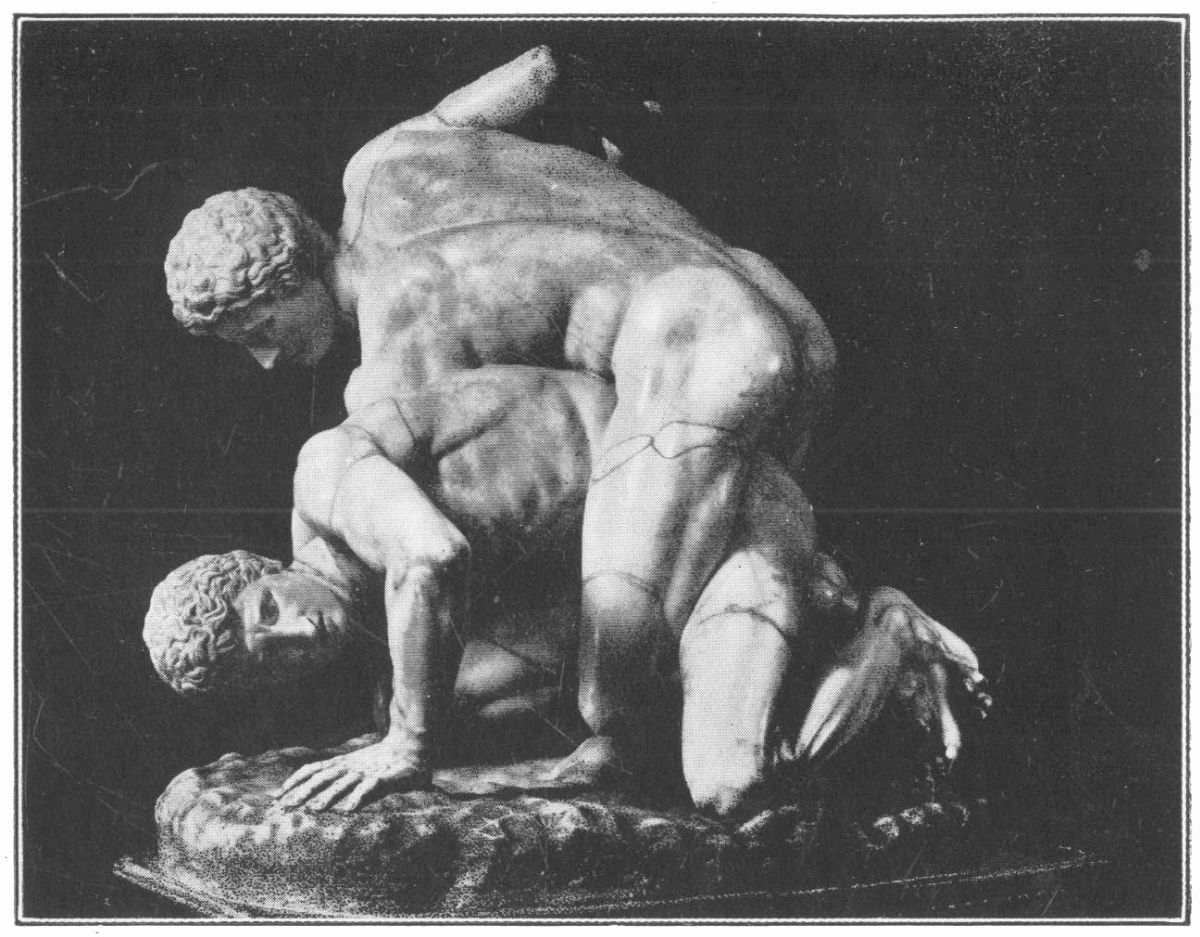 Boxing and wrestling were combined in the pankration and allied with many other devices, such as kicking, strangling, twisting, etc.; it was a versatile performance, the joint invention of Heracles and Theseus, and considered both by Pindar and Philostratus as ‘the fairest of all contests.’ There was an element of danger, but it was no more brutal than is the almost similar method of jujitsu; moreover, strict rules were enforced by umpires who closely watched the combatants. Biting and gouging were strictly forbidden, although frequently attempted, as for example by Alcibiades. ‘You bite like a woman,’ cried his opponent. ‘No,’ said the young Athenian, ‘like a lion.’ Of gouging we have a picture on a cup in the British Museum, where one figure has inserted his finger into his opponent’s eye, while the umpire hurries forward with uplifted rod. But nearly every manœuvre of hands, feet, and body was permissible. You might catch your opponent by his foot and throw him backwards; you might seize his heel or ankle, and then, if you could, twist his foot out of its socket; you might kick him violently in the stomach; you might plant your foot against the other man’s waist and throw him over your shoulder; you might even stand on your own head, if that position seemed expedient. All these tricks were used in the standing position, but the issue of the combat was usually decided on the ground. There you{38} might twist arm or hand, break fingers, and strangle. All neck holds were allowed, but the favourite method of strangling was known as the ‘ladder grip,’ in which you mounted your opponent’s back and wound your legs round his stomach and your arms round his neck. Ground wrestling was indeed the distinctive feature of the pankration, and the well-known group in the Uffizi Palace at Florence represents one of the last stages in such a contest.