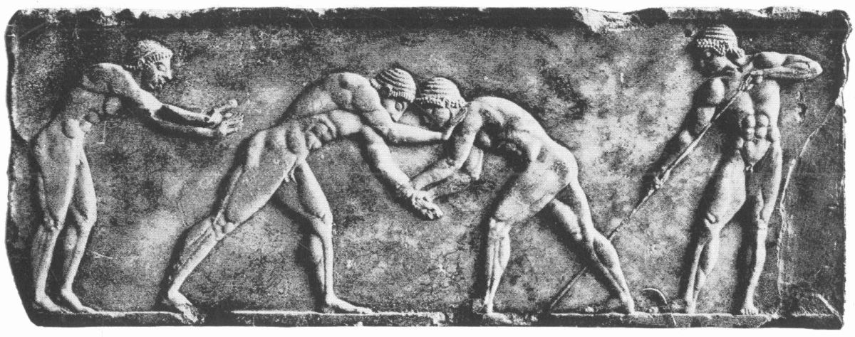 Of the separate exercises, wrestling perhaps was the favourite. It was the oldest of all sports, and to the Greeks one of the most important. To them it was both a science and an art. Theseus, its inventor, was, according to the myth, taught the rules by Athena herself. Victory alone was not sufficient; the winner must win gracefully and according to the precepts of the schools. It was from wrestling that the palæstra took its name, and the Greek language is full of metaphors and expressions borrowed from the technical phraseology of the ring. The contests between Heracles and Antæus, and between Atalanta and Peleus, are two of the best known and most frequently depicted episodes of the heroic saga, and wrestling was one of the sports in which women were allowed by some States—by Sparta and Chios, for example—to take part, competing even against men. Instruction was given in the school; there were separate rules for men and boys, and the different movements, grips, and throws were taught on a system of progressive difficulty; textbooks were used, and fragments of such a manual have recently been found on an Egyptian papyrus. There were two principal styles, the upright wrestling, in which the object was to throw one’s opponent to the ground, three falls being necessary for victory,{30} and the ground wrestling, in which the struggle was continued even after a fall until one of the combatants yielded. The first style, however, was the only one regarded as strictly legitimate, the second being merely part of the pankration. The attitude of a Greek before coming to grips was very similar to that of modern wrestlers, and is beautifully illustrated in the pair of boy statues from Naples which may be seen in the Embankment gardens. Standing square to one another, they endeavoured to get a hold from the front or the side. The defence was often a grip on the opponent’s wrist, which might lead to the offensive if his elbow could also be seized and the throw we call ‘the flying mare’ be then executed. Of front body-holds, the most effective was gained by catching the waist with both hands and then lifting the opponent off his feet, such a hold as Heracles used against Antæus. Of side-throws the best known was ‘the heave,’ usually ascribed to Theseus, where one hand was passed round the opponent’s back and the other hand slipped underneath him. Another favourite hold was by the neck—a strong neck was essential for a wrestler—and when this was secured a sudden turn of the body would lead to the throw that we call a ‘cross-buttock.’ In all wrestling tripping played an important part, and there are a very large number of technical terms in Greek for the different trips that are