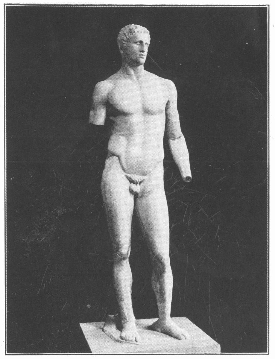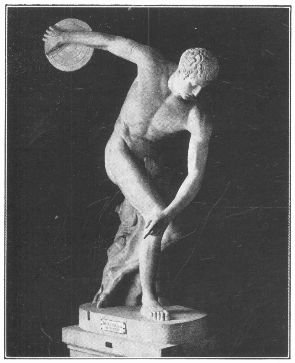 One of the greatest benefits that the ancient Greeks have bestowed upon the modern world, if only we like to make use of it, is the standard of bodily perfection they have bequeathed to us in the remains of their sculpture. Just as Greek literature is eternally precious, not only for itself but as a criterion of beauty, so Greek statuary supplies us with visible proof of the power and grace to which the human body with proper care and training can attain. Besides the Diskobolos we have an admirable example of slender vigour in the Hermes of Praxiteles, of athletic strength in the Hagias of Lysippus, of grave dignity in the Charioteer of Delphi, of poise and balance in the Archers of the Ægina pediment, and of what the Greeks considered perfect proportion in the various copies—all unfortunately rather late and lifeless—of the Doryphoros of Polycleitus, from which the sculptor himself worked out his ideal canon.