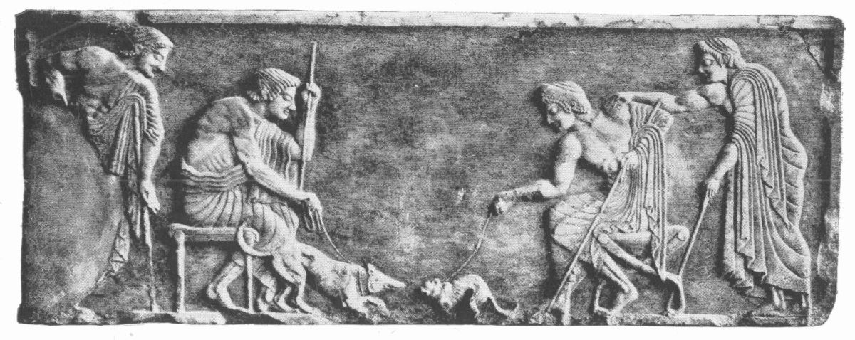 Another of the six reliefs, equally interesting, shows probably the beginning of the most popular{110} and the most energetic of all forms of ball games, the Phæninda, played with a small hard ball stuffed with hair, the Harpastum. The game bore some resemblance to our Rugby, except that the ball was always thrown and never kicked. The scene on the relief represents a throw-in from the touchline; one youth is preparing to throw, the rest are waiting either to seize the ball in the air or to tackle the next possessor. A passage from the comedian Antiphanes, quoted by Athenæus (Bk. I, ch. 26), gives a lively picture: