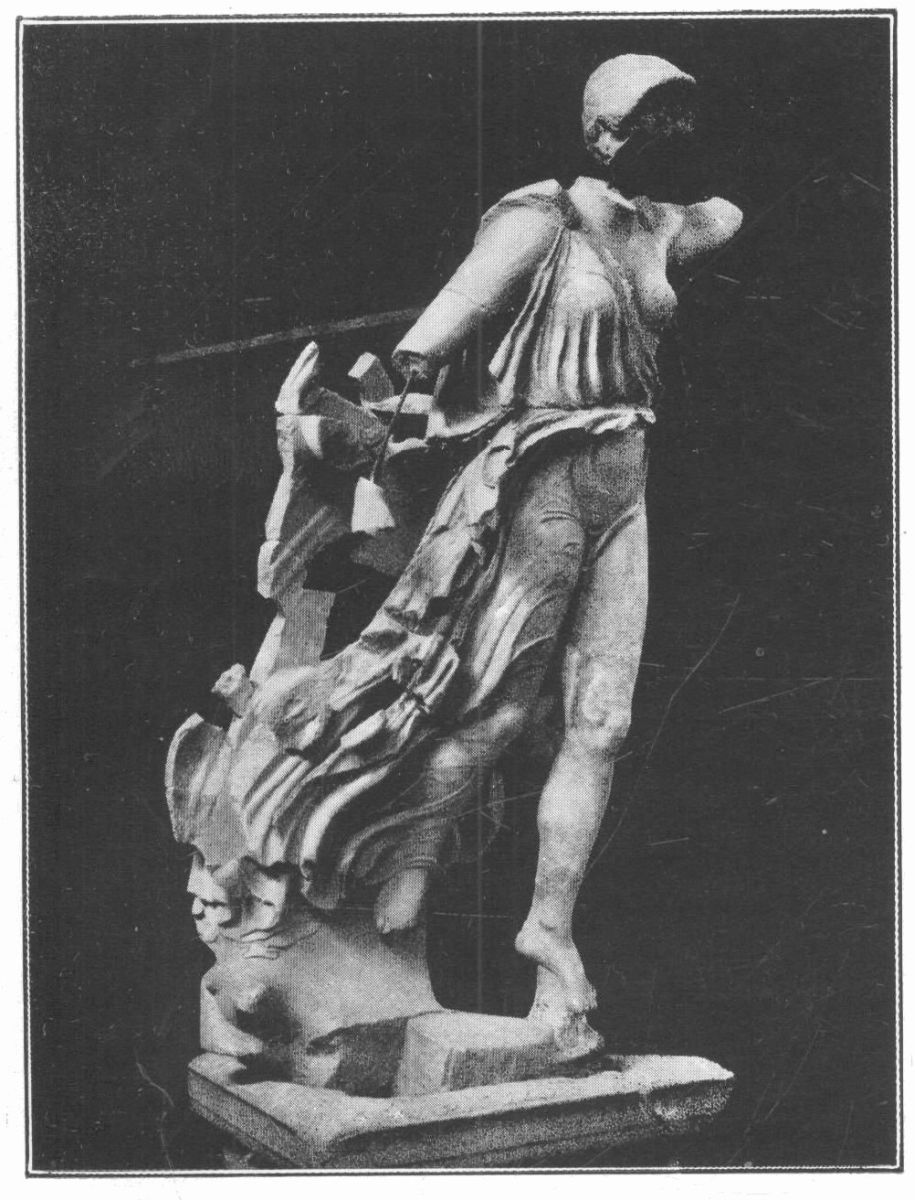 If we need types of more active motion, there is the Amazon from the pediment at Epidaurus, her body perfectly poised as her thigh muscles press the horse’s side; or the Athena of the Æginetan pediment showing us how with proper control of the muscles it is possible to turn the body through three-quarters of a circle without moving the feet; and the exquisite bronze Fortune at Naples, a perfect example of muscular balance—‘drawn up on the extreme points of her toes, she looks as though hovering over the world, light as thistledown, and yet in her tense immobility the very essence of Force.’