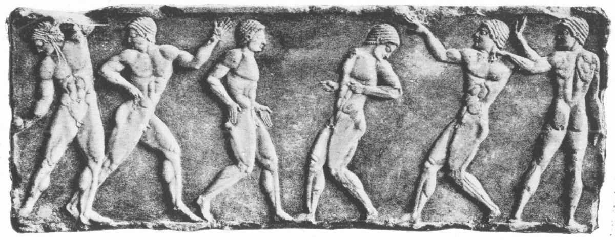 Of running and jumping little need be said, for it is very possible that in neither sport had the Greeks much to teach modern athletes. They were a short-legged people, and although they may have had some advantages in long-distance races they probably would be much inferior to our specialized sprint runners: length of leg must tell, and as in horse-racing ‘a good big ’un’ is better than ‘a good little ’un,’ so in a short-distance race length of stride ensures victory. But running was very popular in Greece, and of the eight events in the early Olympic games no less than four were foot-races, three for men—at 200 yards, 400 yards, and three miles—and one for boys. The running course—the stade—was a straight 200 yards; for the diaulos of 400 yards the runners turned at a post and came back to the starting-point. The start was marked by two parallel lines, for a Greek runner began in a somewhat cramped position,{39} with the feet close together. The runners ran naked, their bodies carefully oiled, and for each man there was a post at the starting and at the finishing point to which he ran; there were no dividing strings, nor was there any tape. Vase paintings of runners are very frequent and plainly show the difference of style between the sprinter and the long-distance man; in the early vases a short, thickset type is common, in the later the thin sprinter is preferred. The most famous names are those of long-distance runners—e.g. Pheidippides and Ladas, whose statue by Myron was even more admired than the same master’s Diskobolos,—and in these races the Cretans and Arcadians especially excelled, while the Athenians were better at short distances. Beside races proper there were various running contests; for example, the race in armour, which was introduced at Olympia towards the close of the sixth century and was the final event of the games, the competitors running in full panoply of shield, helmet, and greaves. Other similar events were the Oschophoria, where youths ran in women’s clothes, and the Lampadophoria, in which a lighted torch was carried by single runners or by teams. These latter were very popular at Athens, and they illustrate the difference between the ancient and modern view of running. They were not serious and specialized enough for a modern athletic meeting, where{40} everything is a matter of record and a fifth of a second is of vital importance.