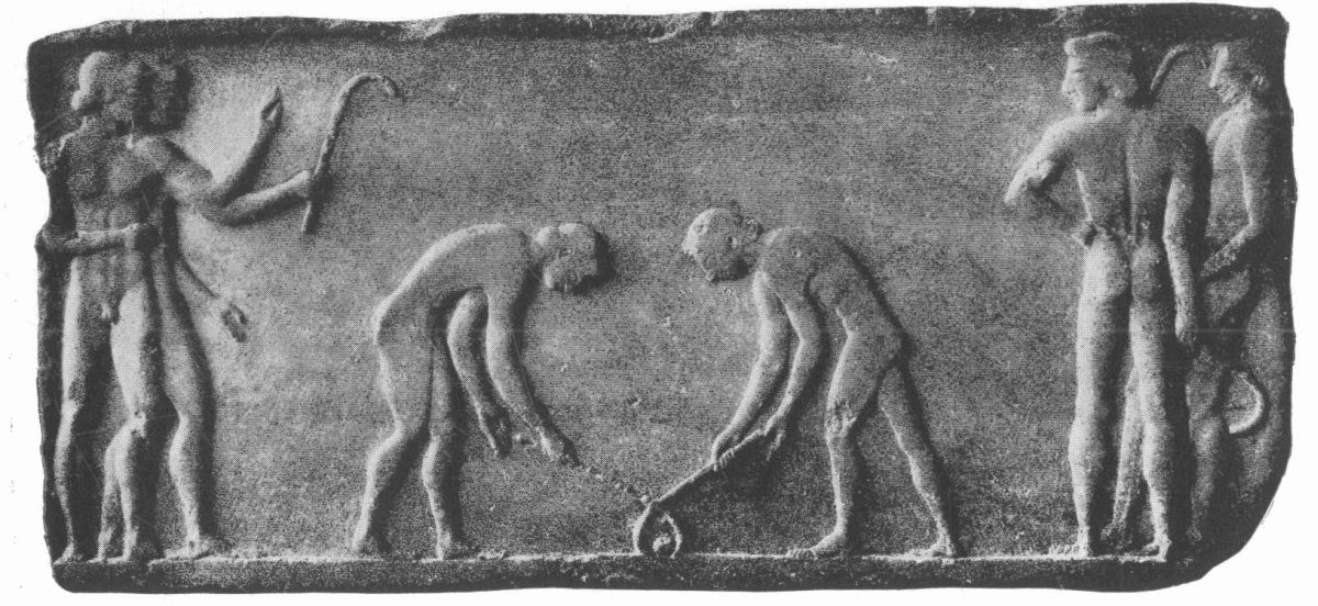 Of the actual details of these ball games we have very few accounts in literature or representations in art. One of the most recent archæological discoveries has, however, thrown light on one point. Up till lately we had no instance of implements being used; but in February, 1922, while the foundations of a shop were being constructed at Athens, sections of the Themistoclean circuit wall were brought to light. Built into them were three quadrangular bases of Pentelic marble with sculptured reliefs on their sides and one of these reliefs shows clearly the details of a hockey match. The ball is on the ground in the exact middle: two youths with sticks are engaged in a ‘bully’ for it precisely in the modern fashion: on either side of them stand two other pairs of youths, with sticks, representing, it may be presumed, the rest of the two competing teams.