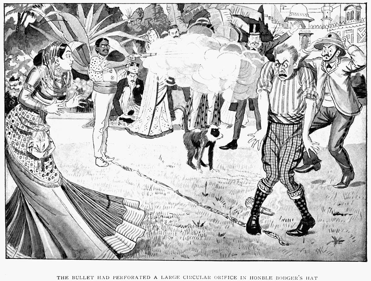 Mr Bodgers ought not to have been drawn in a sun-helmet. He wore, of course, the more ceremonious covering of chimney-pot pattern. But poor Mr Pahtridhji could not perhaps be expected to know this!