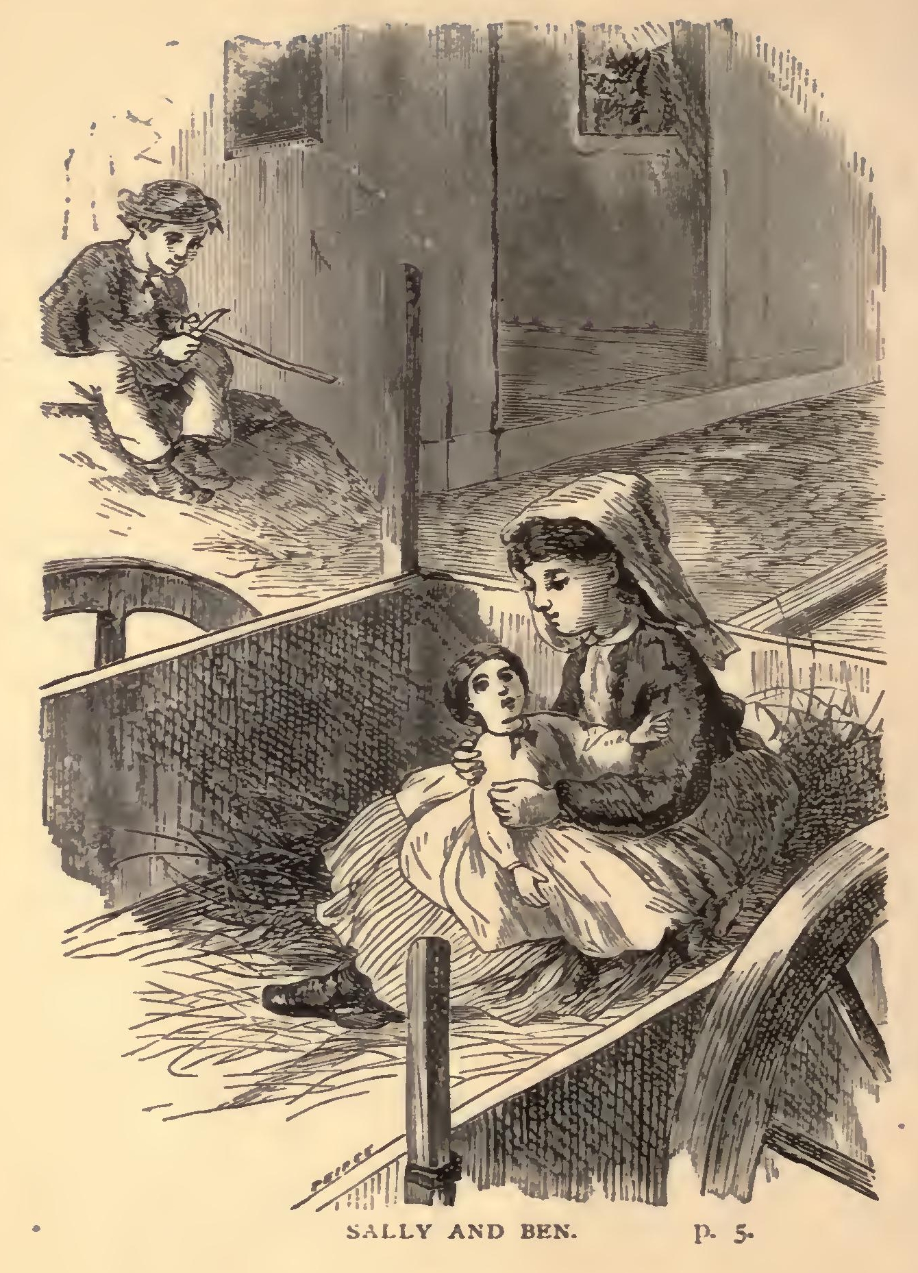 Sally felt that she must find something to occupy her, the moment she had finished her task of hushing the baby. So, while it lay sleeping, she clambered over the edge of the cart, and ran to the kitchen door. A chair was turned down across the sill, and Gill’s little child of nine months old was sitting upon the floor on the other side.
