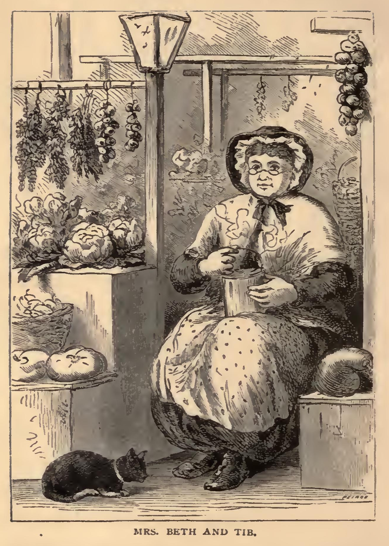 Gill did not stop long in the market. It was never his way to loiter after his errand was finished. He put the baskets of vegetables upon the bench around the stall, and the crisp green cabbages and purple kale and nice cauliflowers upon the table, and turned to go away; but Mrs. Beth had another word to say. She took off her spectacles, and wiped them, and put them on her nose again. Then she lifted Tib upon her knee and stroked gently the creature’s head.
