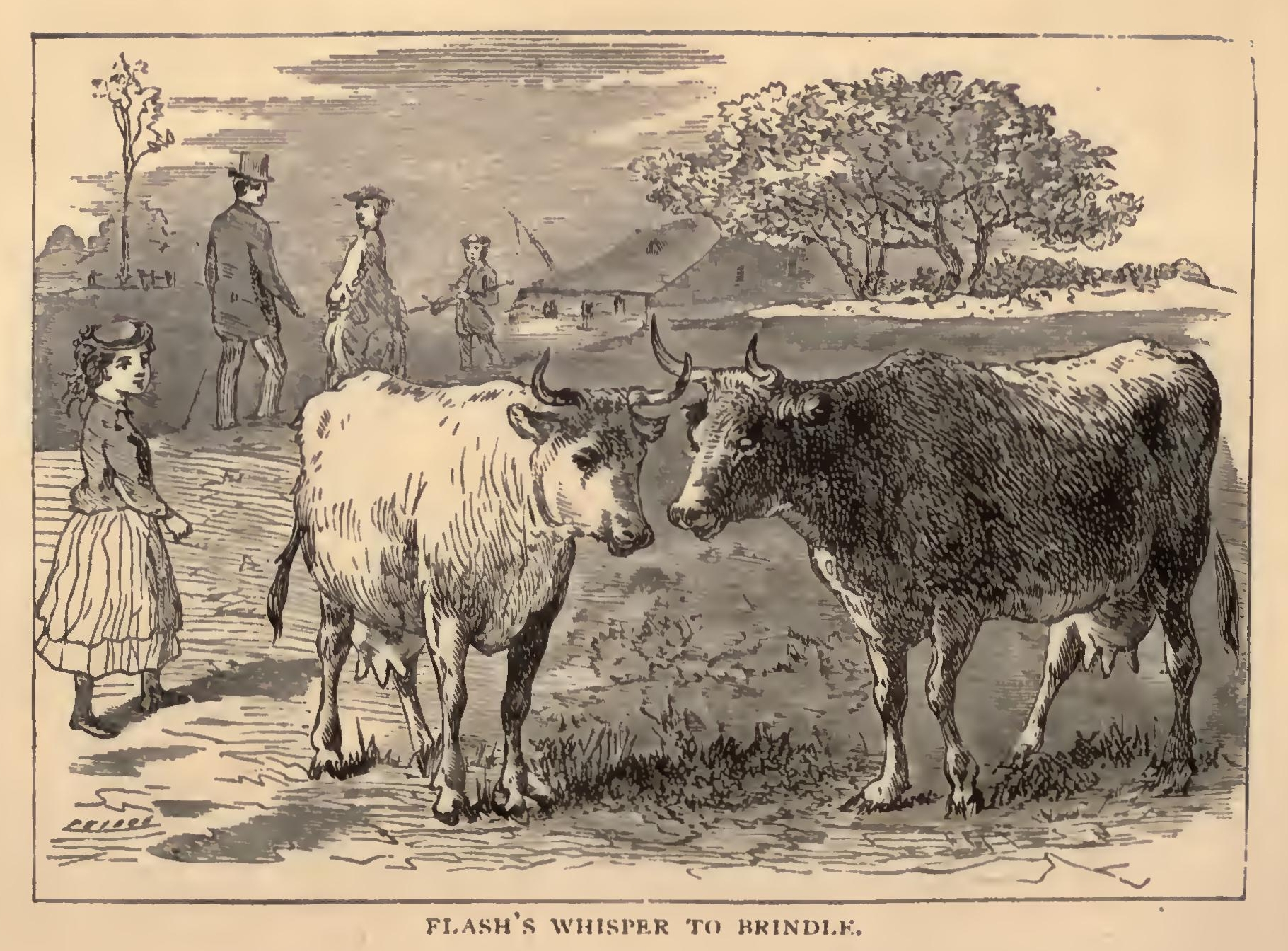 Gill was in the field hoeing, while Sally occupied the cart; and Ben sat upon a large rock that was in a corner of the barn-yard and served as a salt-lick for the cattle,—a lump of the white substance being kept there for the animals to go to at pleasure. The boy was shaping a handle for his hammer, and was talking with Sally about the virtues of his two-bladed jack-knife, which he was trying for the first time. The barn-door was open, and they could see Dobbin standing in his stall eating, preparatory to a trot to town. Dobbin was a plump creature, with a shaggy mane and tail, and long ears that made people say, “He is the son of a jack-ass;” but that is no disgrace to a horse. When it is said of a lad who is vicious and stubborn, and does not try to overcome an obstinate temper, which is partly inherited from a wicked father, it is a term of reproach or contempt. Dobbin deserved only praise. Good, patient, hardworking Dobbin! Always ready to come and go at Gill’s call,—to take a brisk pace toward the market-place with the heaped-up vegetables behind him; or to carry the bags of grain to the mill; or to hold Ben and Sally on his back, and give them a jaunt up and down the road while the Scotchman was getting the evening mash ready for the animal’s supper. Dobbin also earned his rest, as well as the old cart.