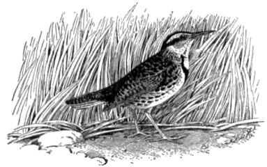 The meadow lark (fig. 11) is a common and well-known bird occurring from the Atlantic Coast to the Great Plains, where it gives way to a closely related subspecies, which extends thence westward to the Pacific. It winters from our southern border as far north as the District of Columbia, southern Illinois, and occasionally Iowa. Although it is a bird of the plains, finding its most congenial haunts in the prairies of the West, it does not disdain the meadows and mowing lands of New England. It nests on the ground and is so terrestrial in its habits that it seldom perches on trees, preferring a fence rail or a telegraph pole. When undisturbed, it may be seen walking about with a peculiar dainty step, stopping every few moments to look about and give its tail a nervous flirt or to sound a note or two of its clear whistle.