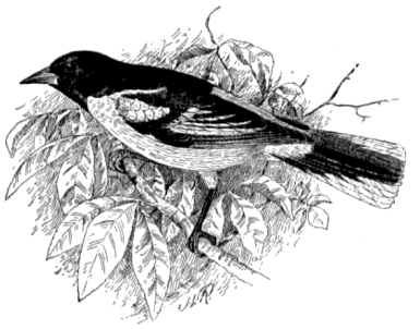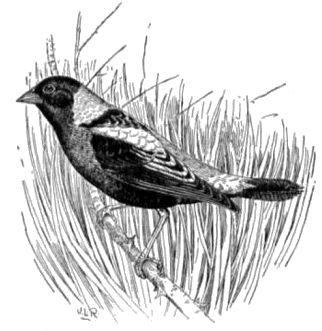 The bobolink (fig. 9) is a common summer resident of the United States, north of about latitude 40°, and from New England westward to the Great Plains, wintering beyond our southern border. In New England there are few birds, if any, around which so much romance has clustered; in the South none on whose head so many maledictions have been heaped. The bobolink, entering the United States from the South at a time when the rice fields are freshly sown, pulls up the young plants and feeds upon the seed. Its stay, however, is not long, and it soon hastens northward, where it is welcomed as a herald of summer. During its sojourn in the Northern States it feeds mainly upon insects and small seeds of useless plants; but while rearing its young, insects constitute its chief food, and almost the exclusive diet of its brood. After the young are able to fly, the whole family gathers into a small flock and begins to live almost entirely upon vegetable food. This consists for the most part of weed seeds, since in the North these birds do not appear to molest grain to any great extent. They eat a few oats, but their stomachs do not reveal a great quantity of this or any other grain. As the season advances they gather into larger flocks and move southward, until by the end of August nearly all have left their breeding grounds. On their way they frequent the reedy marshes about the mouths of rivers and on the inland waters of the coast region, subsisting largely upon wild rice. After leaving the Northern States they are commonly known as reed birds, and having become very fat are treated as game.