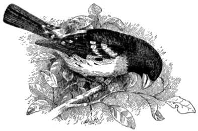The beautiful rose-breasted grosbeak (fig. 15) breeds in the northern half of the United States east of the Missouri River, but spends its winters beyond our boundaries. Unfortunately it is not abundant in New England, and nowhere as plentiful as it should be. It frequents groves and orchards rather than gardens or dooryards, but probably the beauty of the male is the greatest obstacle to its increase; the fully adult bird is pure black and white, with a broad patch of brilliant rose color upon the breast and under each wing. On account of this « 29 » attractive plumage the birds are highly prized for ladies' hats; and consequently heave been shot in season and out, till the wonder is not that there are so few, but that any remain at all.
