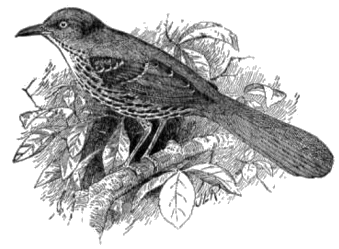 The brown thrasher (fig. 19) breeds throughout the United States east of the Great Plains, and winters in the south Atlantic and Gulf States. It occasionally visits the garden or orchard, but nests in swamps or in groves standing upon low ground. While it generally prefers a thickly grown retreat, it sometimes builds in a pile of brush at a distance from trees. On account of its more retiring habits it is not so conspicuous as the robin, although it may be equally abundant. Few birds can excel the thrasher in sweetness of song, but it is so shy that its notes are not heard often enough to be appreciated. Its favorite time for singing is the early morning, when, perched on the top of some tall bush or low tree, it gives an exhibition of vocal powers which would do credit to a mockingbird. Indeed, in the South, where the latter bird is abundant, the thrasher is known as the sandy mocker.