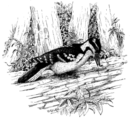 An examination of many stomachs of these two birds shows that from two-thirds to three-fourths of the food consists of insects, chiefly noxious. Wood-boring beetles, both adults and larvæ, are conspicuous, and with them are associated many caterpillars, mostly species that burrow into trees. Next in importance are the ants that live in decaying wood, all of which are sought by woodpeckers and eaten in great quantities. Many ants are particularly harmful to limber, for if they find a small spot of decay in the vacant burrow of some wood-borer, they enlarge the hole, and as their colony is always on the increase, continue to eat away the wood until the whole trunk is honey-combed. Moreover, these insects are not accessible to other birds, and could pursue their career of destruction unmolested were it not that the woodpeckers, with beaks and tongues especially fitted for such work, dig out and devour them. It is thus evident that woodpeckers are great conservators of forests. To them, more than to any other agency, we owe the preservation of timber from hordes of destructive insects.
