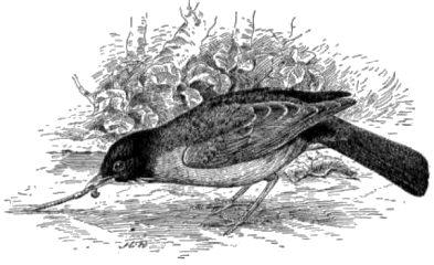 The depredations of the robin seem to be confined to the smaller and earlier fruits, and few, if any, complaints have been made against it on the score of eating apples, peaches, pears, grapes, or even late cherries. By the time these are ripe the forests and hedges are teeming with wild fruits, which the bird evidently finds more to its taste. The cherry, unfortunately, ripens so early that it, is almost the only fruit accessible at a time when the bird's appetite has been sharpened by a long-continued diet of insects, earthworms, and dried berries, and it is no wonder that at first the rich juicy morsels are greedily eaten. In view of the fact that the robin takes ten times as much wild as cultivated fruit, it seems unwise to destroy the birds to save so little. Nor is this necessary, for by a little care both may be preserved. Where much fruit is grown, it is no great loss to give up one tree to the birds; and in some cases the crop can be protected by scarecrows. Where wild fruit is not abundant, a few fruit-bearing shrubs and vines judiciously planted will serve for ornament and provide food for the birds. The Russian mulberry is a vigorous grower and a profuse bearer, ripening at the same time as the cherry, and, so far as observation has gone, most birds scorn to prefer its fruit to any other. It is believed that a number of these trees planted around the garden or orchard would fully protect the more valuable fruits.