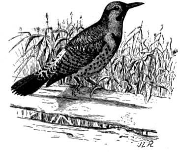 One of the larger woodpeckers familiar to everyone is the flicker, or golden-winged woodpecker (Colaptes auratus) (fig. 3), which is generally distributed throughout the United States from the Atlantic Coast to « 8 » the Rocky Mountain. It is there replaced by the red-shafted flicker (C. cafer), which extends westward to the Pacific. The two species are as nearly identical in food habits as their environment will allow. The flickers, while genuine woodpeckers, differ somewhat in habits from the rest of the family, and are frequently seen upon the ground searching for food. Like the downy and hairy woodpeckers, they eat wood-boring grubs and ants, but the number of ants eaten is much greater. Two of the flickers' stomachs examined were completely filled with ants, each stomach containing more than 3,000 individuals. These ants belonged to species which live in the ground, and it is these insects for which the flicker is searching when running about in the grass, although some grasshoppers are also taken.