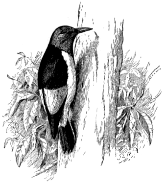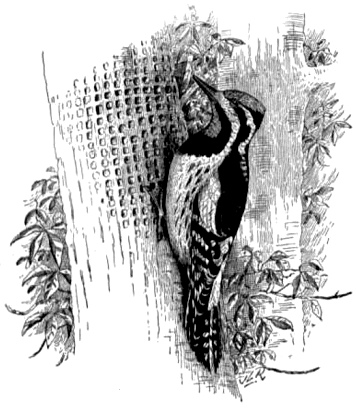 It has been customary to speak of the smaller woodpeckers as "sapsuckers," under the belief that they drill holes in the bark of trees for the purpose of drinking the sap and eating the inner bark. Close observation, however, has fixed this habit upon only one species, the yellow-bellied woodpecker, or sapsucker (Sphyrapicus varius) (fig. 5). This bird has been shown to be guilty of pecking holes in the bark of various forest trees, and sometimes in that of apple trees, from which it drinks the sap when the pits become filled. It has been proved, however, that besides taking the gap the bird captures large numbers of insects which are attracted by the sweet fluid, and that these form a very considerable portion of its diet. In some cases the trees are injured by being thus punctured, and die in a year or two, but since comparatively few are touched the damage is not great. It is equally probable, moreover, that the bird fully compensates for this injury by the insects it consumes.