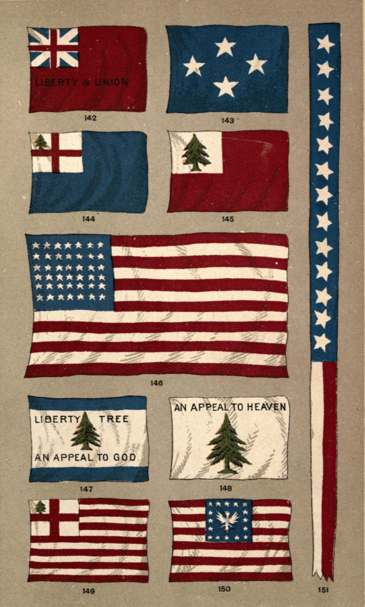 The Israelites carried the sacred standard of the Maccabees, with the initial letters of the Hebrew text, "Who is like unto Thee, O God, amongst the gods?" The Emperor Constantine caused the sacred monogram of Christ to be placed on the Labarum, and when the armies of Christendom went forth to rescue the Holy Land from the infidel they received their cross-embroidered standards from the foot of the altar. Pope Alexander II. sent a consecrated white banner to Duke William previous to his expedition against Harold, and we read in the "Beehive of the Romish Church," published in 1580, how "the Spaniardes christen, conjure, and hallow their Ensignes, naming one Barbara, another Katherine," after the names of saints whose aid they invoked in the stress of battle. We may see this invocation again very well in Figs. 147, 148: flags borne by the colonists of Massachusetts when they arrayed themselves against the mercenaries of King George, and appealed to the God of Battles in behalf of the freedom and justice denied by those who bore rule over them.