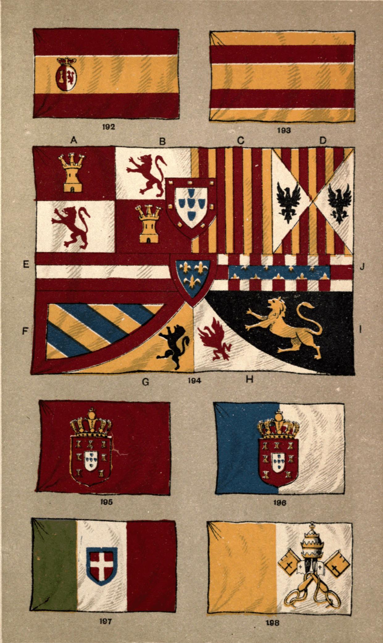 [33] Thus in the Royal Standard of Spain, Fig. 194, the arms of Leon and Castile being In the upper corner next the staff take precedence of honour over Arragon and all the other States therein introduced.