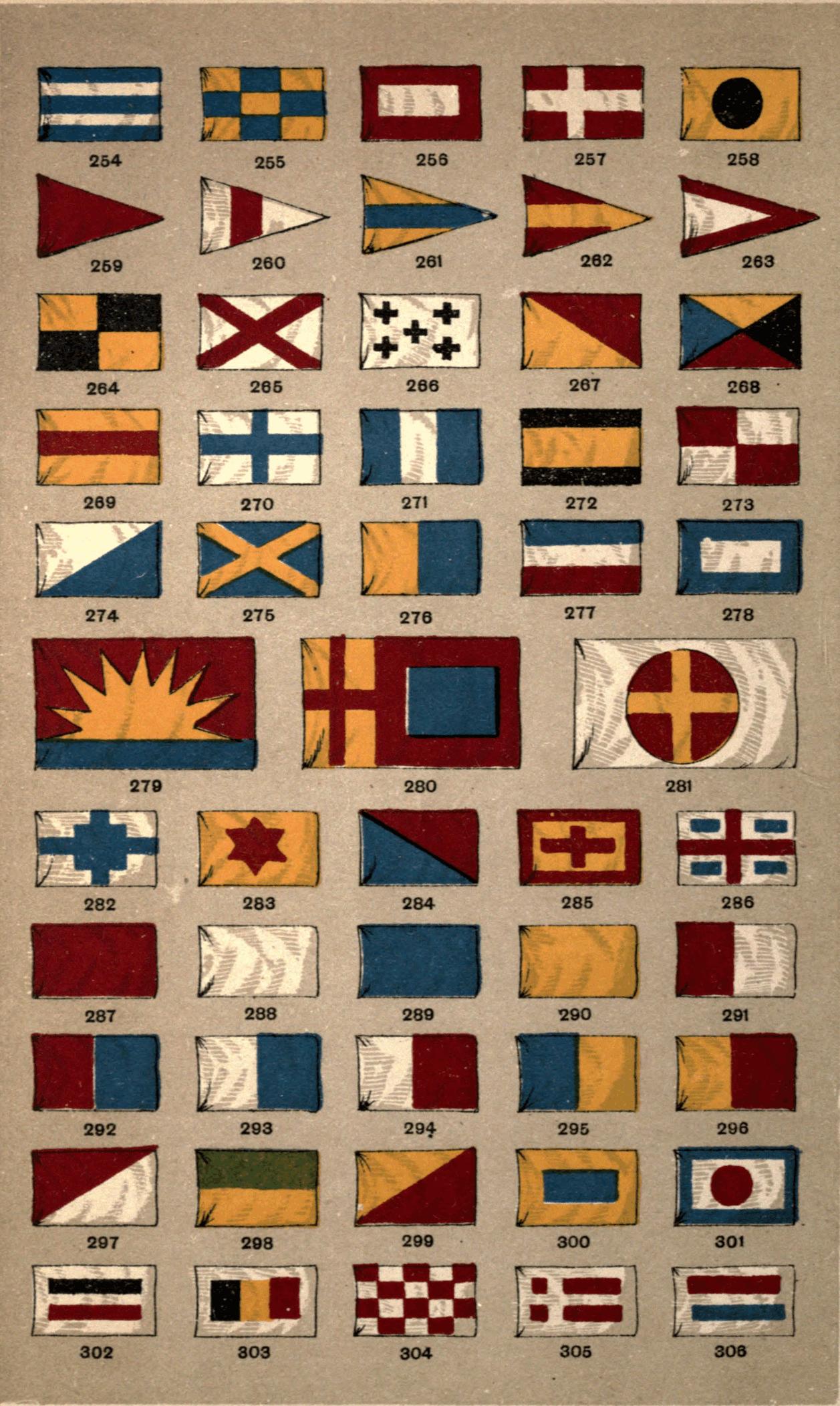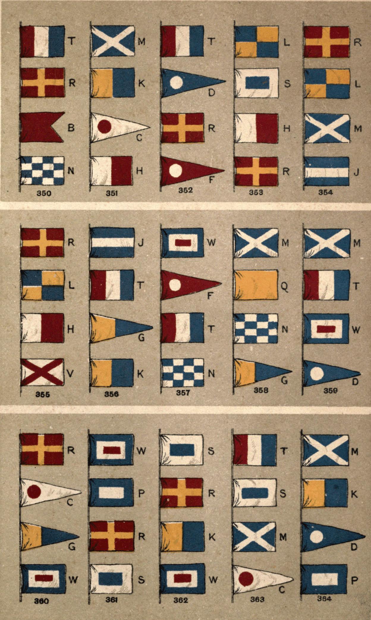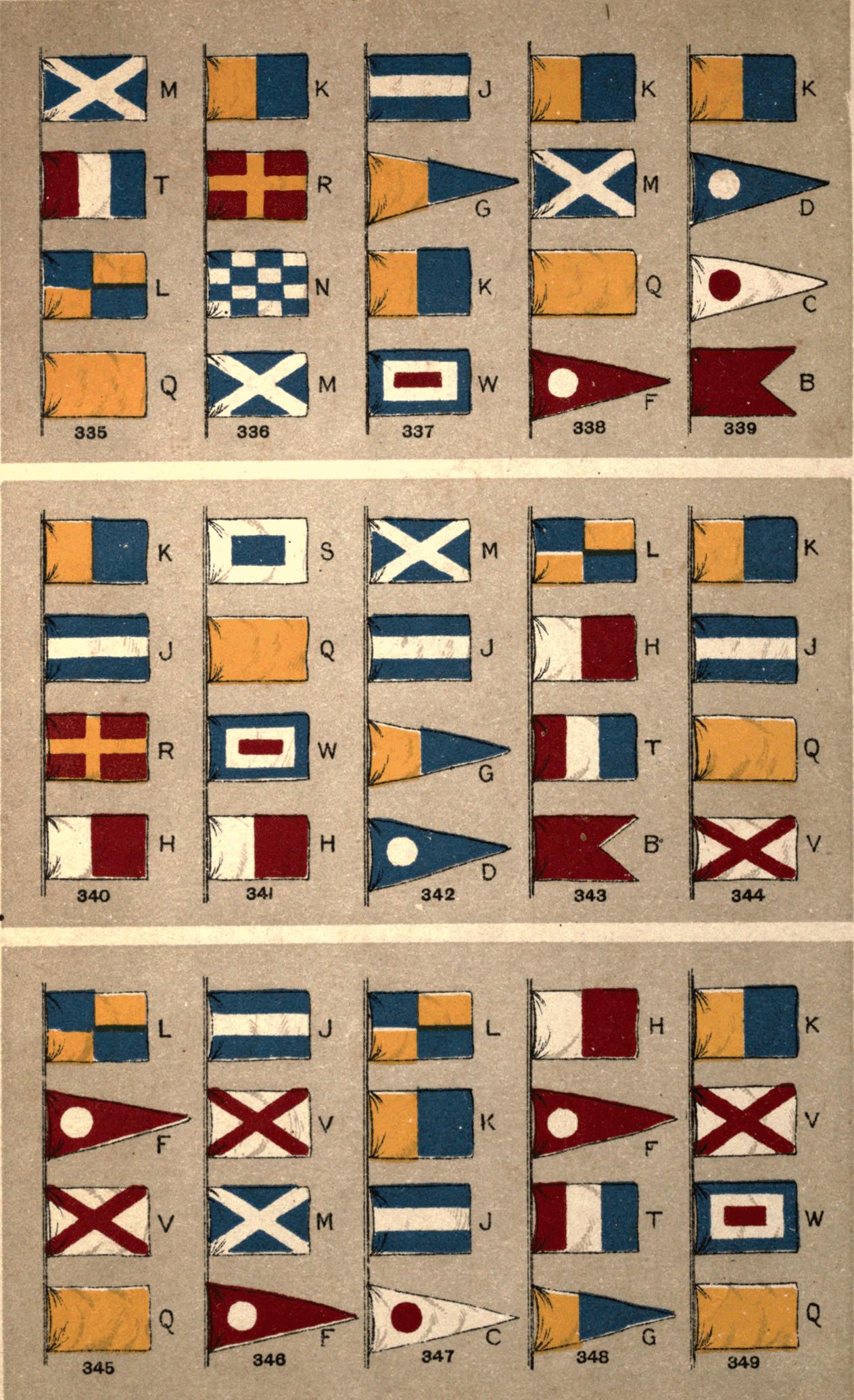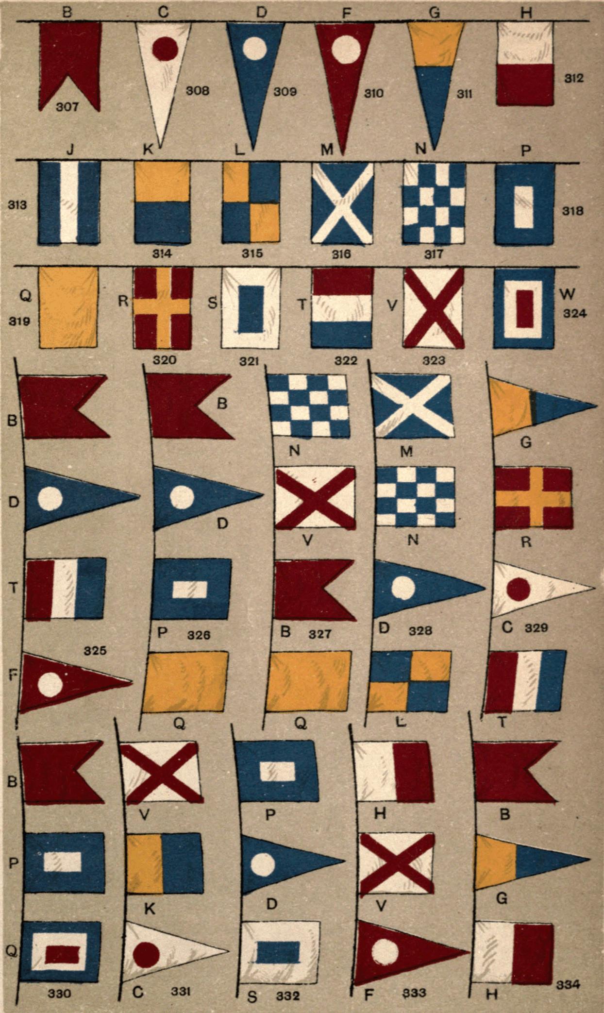 [16] The "house-flags" of the various shipping companies make a great use of letters: thus the flag of the Orient Steam Navigation Company is white and divided into four portions by a blue cross. In these four portions are placed in red the letters O.S.N.C. In Fig. 120 we have the flag of the New Zealand Shipping Company, where the N.Z.S. Co. are equally conspicuous. Any reference to a good list of house-flags, such as that published by Griffin, would reveal scores of illustrations of this feature.