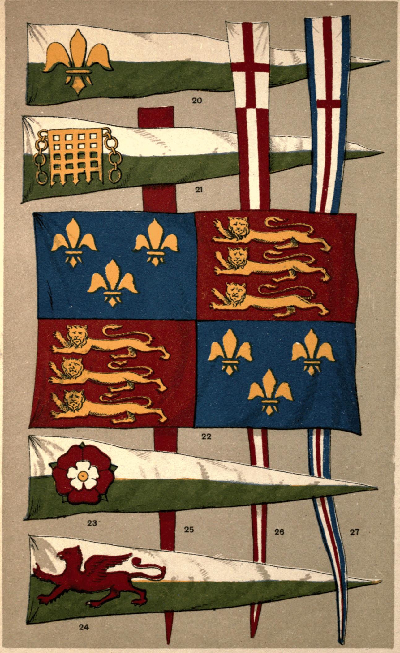 | The Royal Standard—the Three Lions of England—the Lion Rampant of Scotland—Scottish sensitiveness as to precedence—the Scottish Tressure—the Harp of Ireland—Early Irish Flags—Brian Boru—the Royal Standards from Richard I. to Victoria—Claim to the Fleurs-de-lys of France—Quartering Hanover—the Union Flag—St. George for England—War Cry—Observance of St. George's Day—the Cross of St. George—Early Naval Flags—the London Trained Bands—the Cross of St. Andrew—the "Blue Blanket"—Flags of the Covenanters—Relics of St. Andrew—Union of England and Scotland—the First Union Flag—Importance of accuracy in representations of it—the Union Jack—Flags of the Commonwealth and Protectorate—Union of Great Britain and {iv} Ireland—the Cross of St. Patrick—Labours of St. Patrick in Ireland—Proclamation of George III. as to Flags, etc.—the Second Union Flag—Heraldic Difficulties in its Construction—Suggestions by Critics—Regulations as to Fortress Flags—the White Ensign of the Royal Navy—Saluting the Flag—the Navy the Safeguard of Britain—the Blue Ensign—the Royal Naval Reserve—the Red Ensign of the Mercantile Marine—Value of Flag-lore | 29 |
