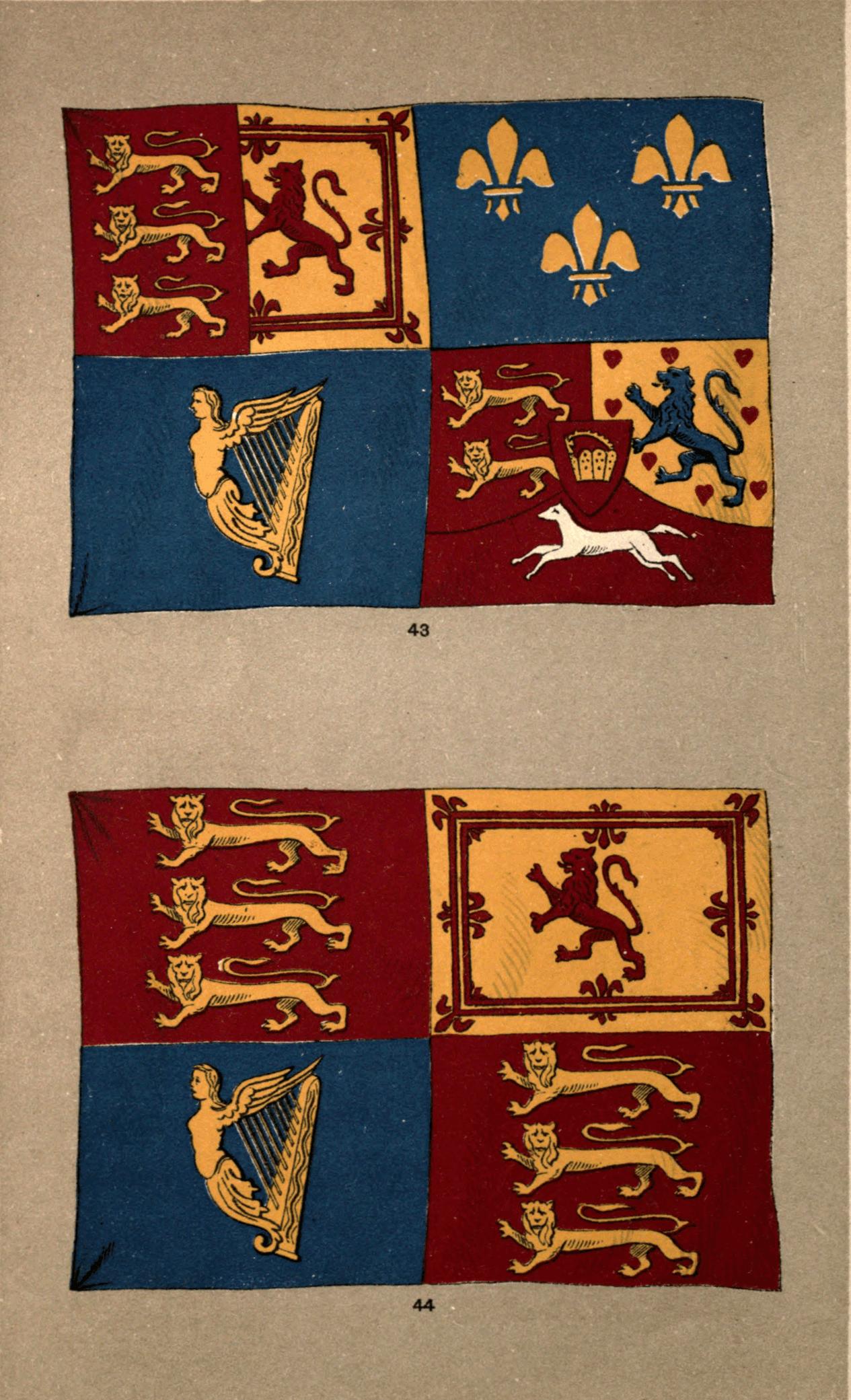 [23] The following summary may be taken as correct in its broad facts:—From about 1195 to 1340, the Standard had the lions of England alone on it. From 1340 to 1377, England and France together. 1377 to 1399, England, France, and the arms of Edward the Confessor. 1399 to 1603, England and France. 1603 to 1649, England, France, Scotland and Ireland. 1649 to 1659, Interregnum: a period of change and uncertainty, when divers changes in the Standard were made that are scarcely worth detailing. 1659 to 1688, England, France, Scotland, and Ireland. 1688 to 1701, England, France, Scotland, Ireland, and Nassau. 1701 to 1714, England, France, Scotland, and Ireland. 1714 to 1801, England, France, Scotland, Ireland, and Hanover. 1801 to 1837, England, Scotland, Ireland, and Hanover. From 1837, England, Scotland, and Ireland.