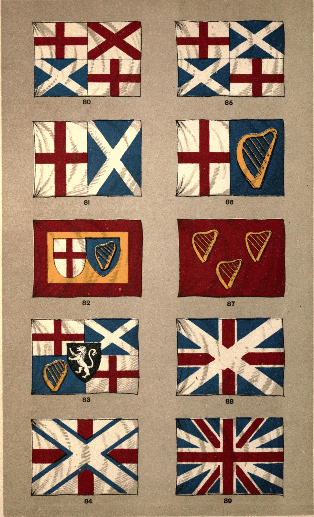 Early flags were almost purely of a religious character.[3] The first notice of banners in England is in Bede's description of the interview between the heathen King Ethelbert and Augustine, the missionary from Rome, where the followers of the latter are described as bearing banners on which were displayed silver crosses; and we need scarcely pause to point out that in Roman Catholic countries, where the ritual is emotional and sensuous, banners of this type are still largely employed to add to the pomp of religious processions. Heraldic and political devices upon flags are of later date, and even when these came freely into use their presence did not supplant the ecclesiastical symbols. The national banner of England for centuries—the ruddy cross of her patron Saint George (Fig. 91)—was a religious one, and, whatever other banners were carried, this was ever foremost in the field. The Royal banner of Great Britain and Ireland that we see in Fig. 44, in its rich blazonry of the lions of England and Scotland and the Irish harp, is a good example of the heraldic flag, while our Union flag (Fig. 90), equally symbolizes the three nations of the United Kingdom, but this time by the allied crosses of the three patron saints, St. George, St. Andrew, and St. Patrick, and it is therefore a lineal descendant and exemplar of the religious influence that was once all-powerful.
