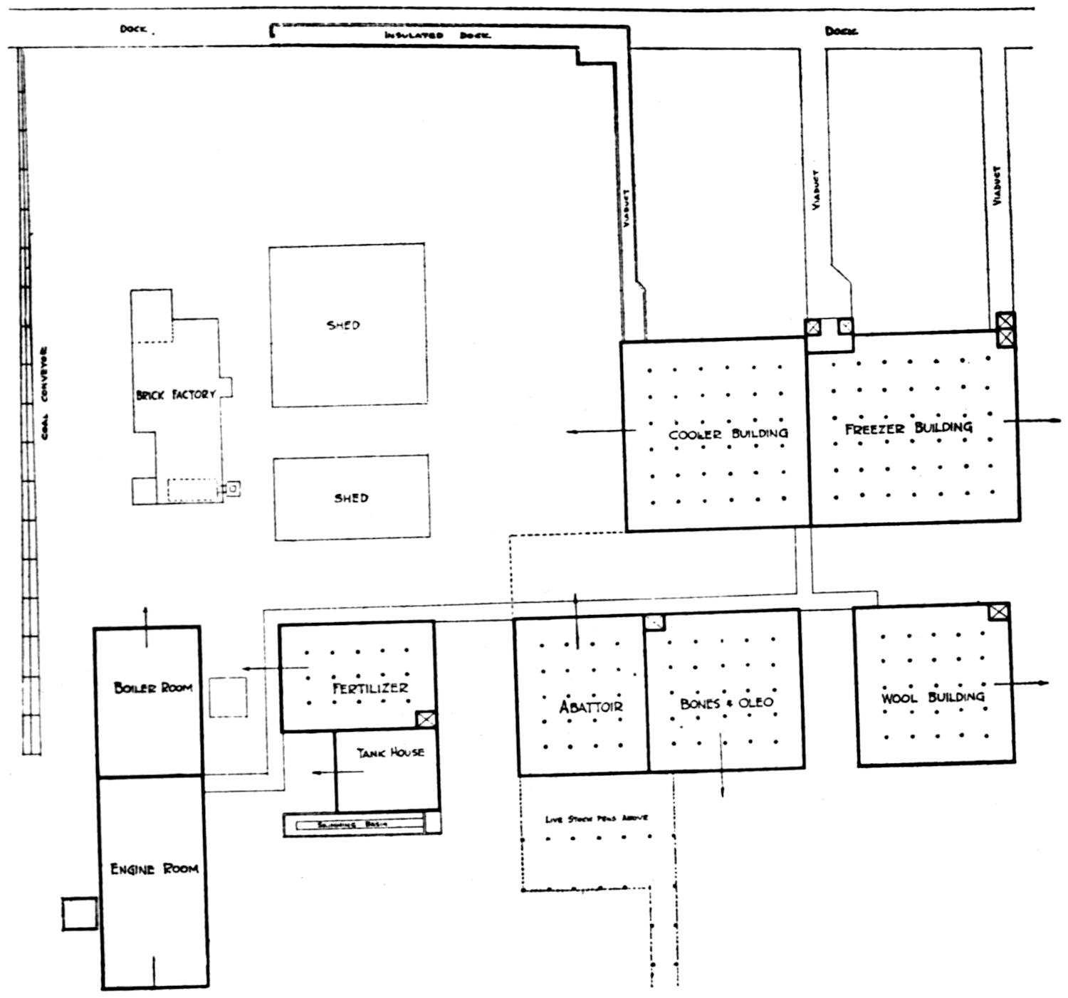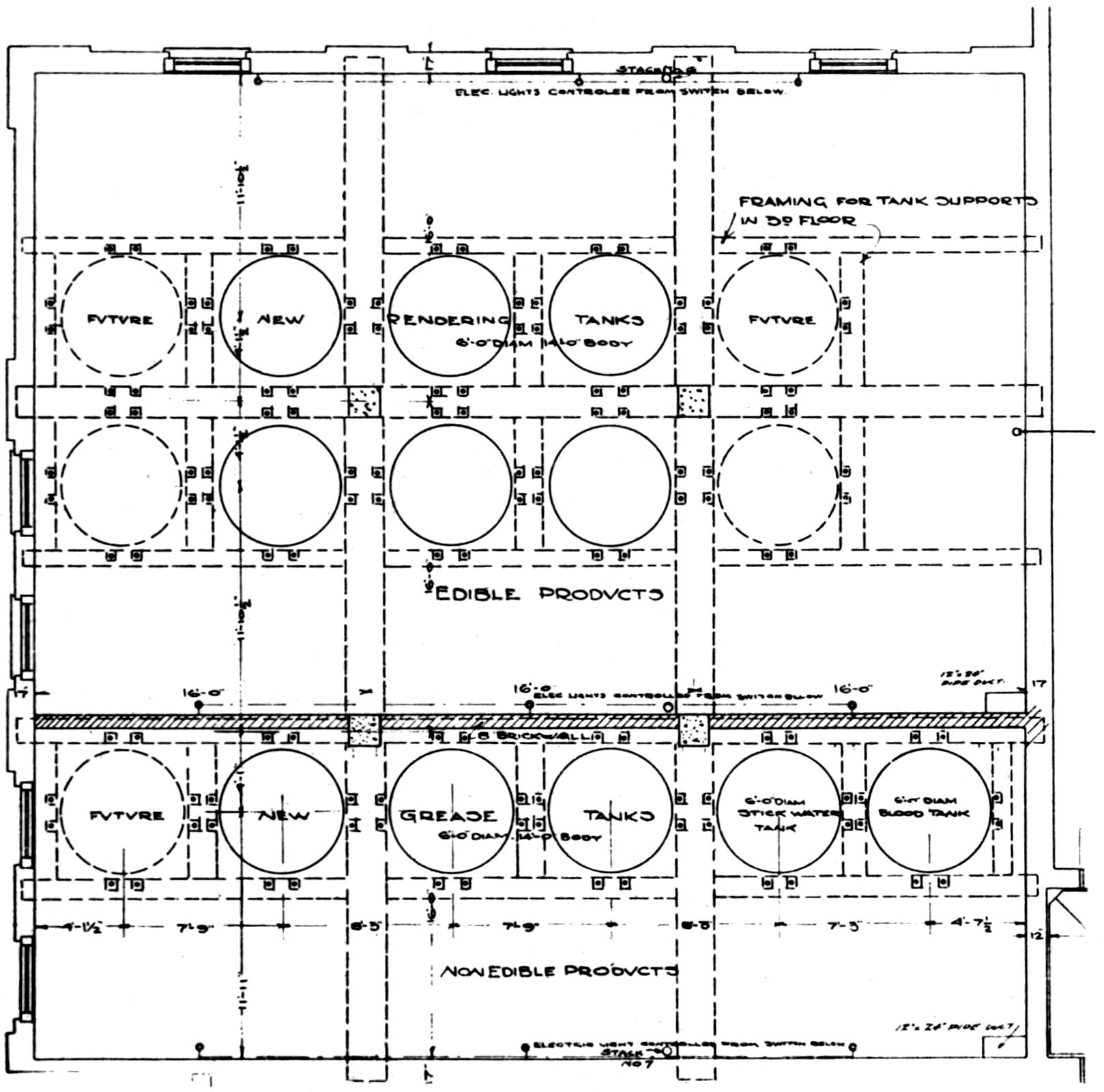 | Bone Department — Hard Bone — Glue Bone — Bone Products — Horns — Manufactured Articles — Skulls — Test Yield from Skulls and Feet — Buttocks and Thighs — Blades and Ribs — Drying — Crushed Bone — Grinding Bone — Neats Foot Oil Storage — Neats Foot Oil Purifier — Yield Tests. | |