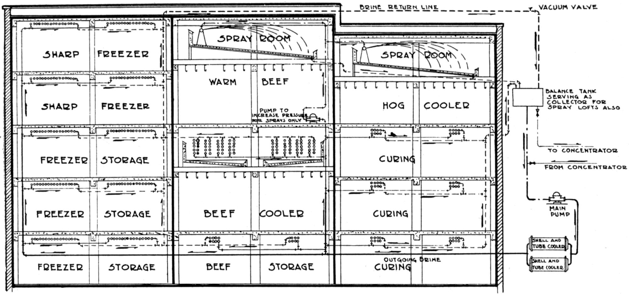 A general reference work on the design construction and equipment of modern meat packing and cold storage plants including refrigeration, insulation and other data.
